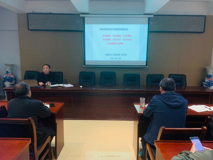 4月13日,太阳成集团tyc122cc在理科楼连廊402会议室开展党史学习教育专题报告会,报告会题目为《准确理解“学史明理、学史增信、学史崇德、学史力行”科学内涵,切实增强学习效果》,主讲人为公司党委书记柳士刚,公司全体教工党员参加了报告会。
