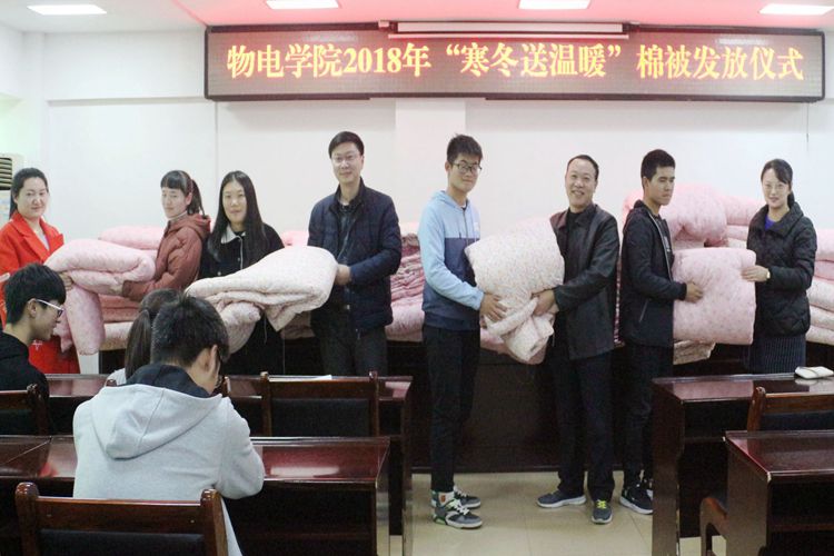 柳士刚发表讲话。他讲道,此次活动旨在贯彻落实党的十九大精神和全国教育大会精神,为贫困学子送去温暖,提供生活保障,希望学子们加强道德修养,锤炼道德品质,树立正确的世界观、人生观、价值观,继承和弘扬中华民族优良道德传统,不断提高自身综合素质和专业知识水平,学有所成、回馈社会。学子们认真聆听、深受鼓舞,纷纷表示将在学好专业知识的同时注重个人文化修养,胸怀远大志向,心系国家发展,持感恩之心、执奋斗之笔谱写青春路上的华丽篇章。棉被发放期间,与会领导老师亲自为贫困员工发放棉被,耐心询问贫困学子生活、学习上的困难,并给予其鼓励和支持,场面温馨和谐、感人至深。