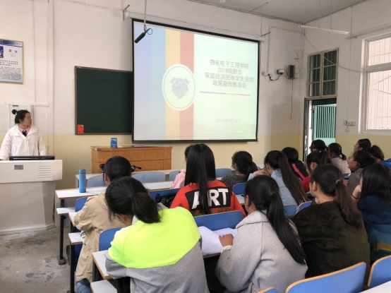 为了改善广大学子的学习生活质量,扎实推进精准扶贫工作,太阳成集团tyc122cc于9月14日中午在教三楼302多媒体教室成功召开了2018级新生家庭经济困难员工资助政策宣传教育会。资助专员赵雪担任宣讲会主讲,2018级全体新生共同聆听。