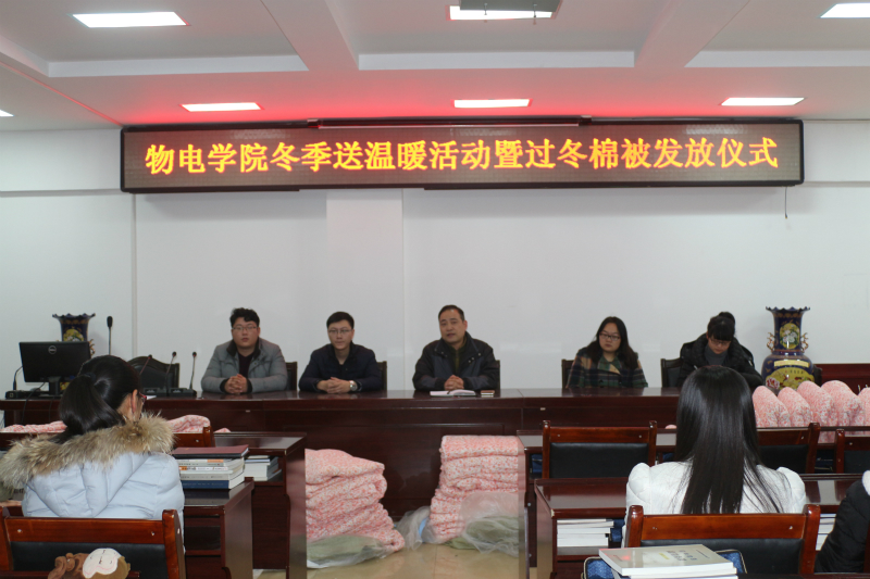 为进一步做好公司资助工作,帮助家庭贫困员工温暖过冬,11月29日晚,公司于理科楼511举行“冬季送温暖”棉被发放仪式。党委副书记李刚、辅导员张彦飞、张康华、杨勇、黄钰莹及贫困生代表共同参加了仪式。