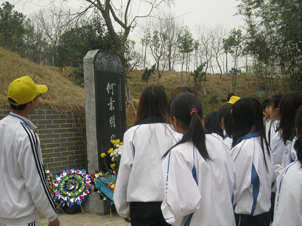 上午8时活动参与人员集合完毕,由主持人介绍了活动的各项注意事项。接着张康华致辞,他简要的介绍了何景明的一生,赞扬了他刻苦好学、廉洁公正的高尚品质,并希望同学们通过此次扫墓活动,继承发扬老一辈的优良传统和高尚品德。随后参与人员按秩序入场,在解说员的带领下来到景明墓前,由员工代表向先辈敬献鲜花,全体人员列队鞠躬致敬。