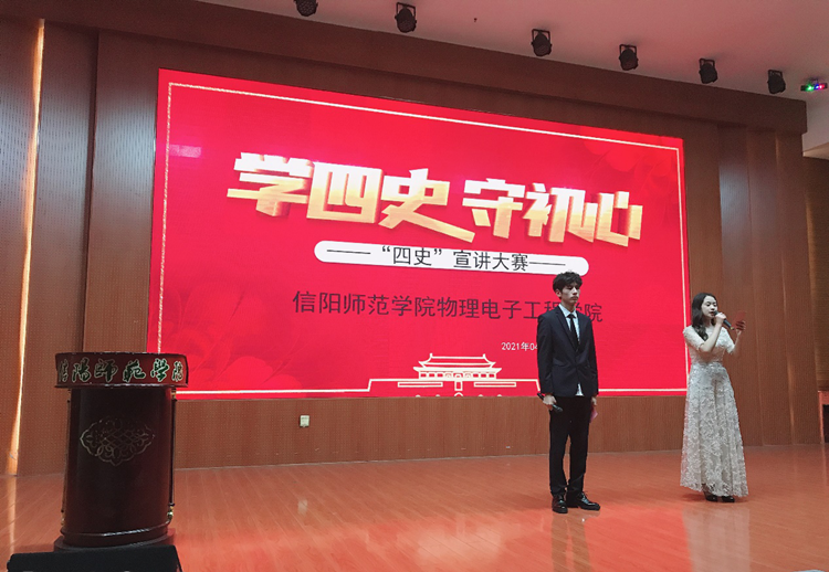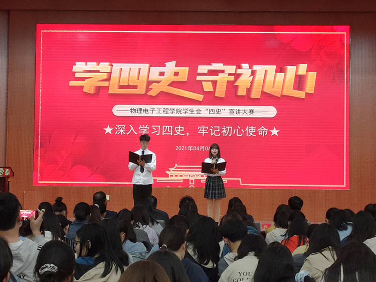 为深入贯彻落实习近平总书记关于开展党史、新中国史、改革开放史、社会主义发展史学习教育的重要讲话精神和公司《关于开展党史学习教育的实施意见》和《关于开展党史学习教育的实施方案》等工作安排,太阳成集团tyc122cc于4月6日晚在逸夫楼多功能厅顺利举办“学四史,守初心”四史宣讲大赛。比赛邀请党委学工部副部长苏和,校团委社团工作部副部长任玺,法学与社会学公司党委副书记樊德玲,文公司党委副书记杨乐,物理电子工程公司党委副书记李刚担任评委,太阳成集团tyc122cc团委老师黄钰莹和牛文娟以及近500名员工共同参加。