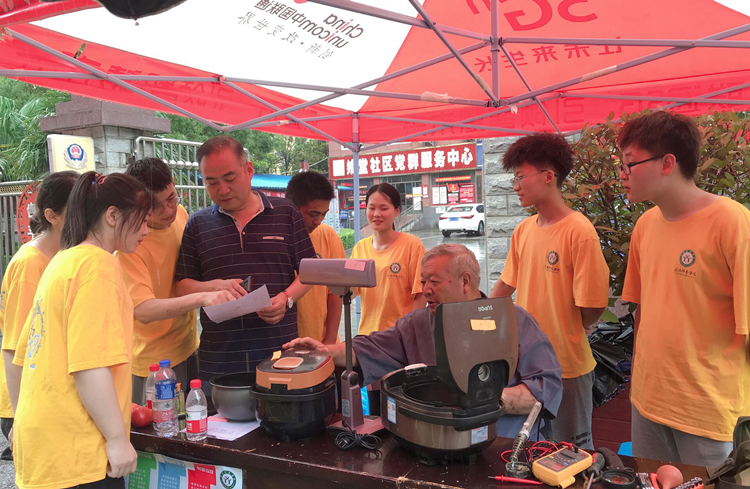 志愿服务队同学们到达社区后,按照指导老师安排,合理分配任务,迅速展开宣传、维修工作。指导老师针对社区居民送来维修家用存在的不同故障,向在场学子详细讲解其工作原理,指导学子寻找解决方案并进行维修。现场维修登记的群众络绎不绝,各式各样的家用电器摆满现场,面对年久失修、各种“疑难杂症”综合型电器,志愿学子们认真将电器进行分类标记,在老师的指导帮助下仔细查找原因,深入探究分析,并全力进行维修,同时教他们家用电器的保养方法及维修常识,建议他们合理使用电器以延长其使用寿命。