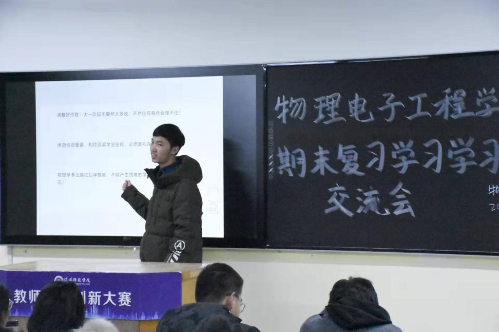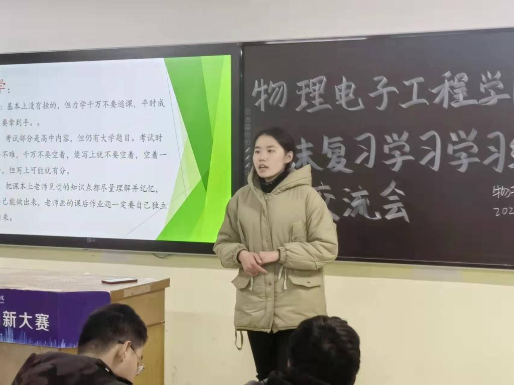 2020级物理学班优秀员工代表张清哲结合精美的幻灯片从如何克服考试焦虑、分享自己的学习方法、提出良好的学习建议和向同学们答疑解惑四个方面与学子们进行深刻交流。他希望各位学子能克服考试焦虑,正视考试难度,重视每门学科的学习,积极融入到课堂学习中去。接着他针对不同学科提出合理的建议,对于偏文科类的科目,建议同学们要积极背诵。对于一些难度较大的科目,需要学子们要多钻研思考。张清哲以自身经历告诫同学们面对学习中的困难,要努力克服,不能产生畏难的心理。最后他针对学子们的特性问题,逐个解答,提出合理化建议。