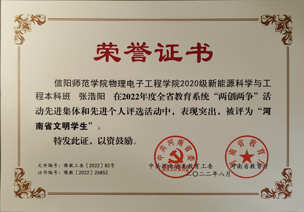 近日,由中共河南省委高校工委、河南省教育厅关于开展2022年度“两创两争”活动先进个人评选活动结果揭晓,公司优秀学子2020级新能源班张浩阳荣获河南省“文明员工”荣誉称号。