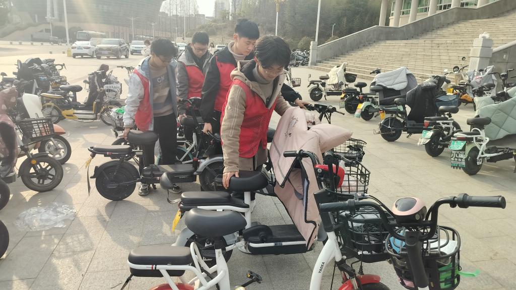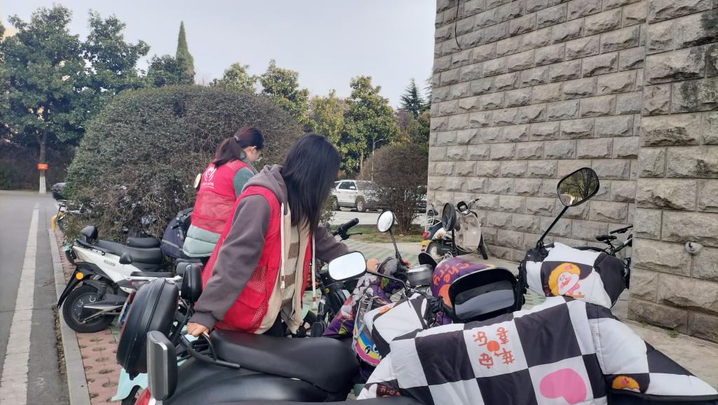 活动过程中,志愿者们准时到达指定地点集合,按照人数分为两组,一组负责规范摆放在行政楼、理科楼和化学楼下的电动车,另一组负责规范摆放在艺术楼、体育馆和图书馆下的电动车。志愿者们身着红马甲,发扬不怕苦、不怕累的精神,对各个区域的电动车进行了细致整理。