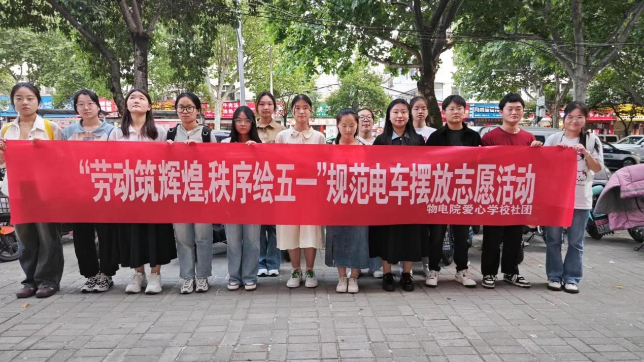 为弘扬劳动精神、培育文明风尚,4月26日,公司于飨堂社区开展“劳动筑辉煌,秩序绘五一”规范电车摆放志愿活动,爱心公司社团成员积极参加。