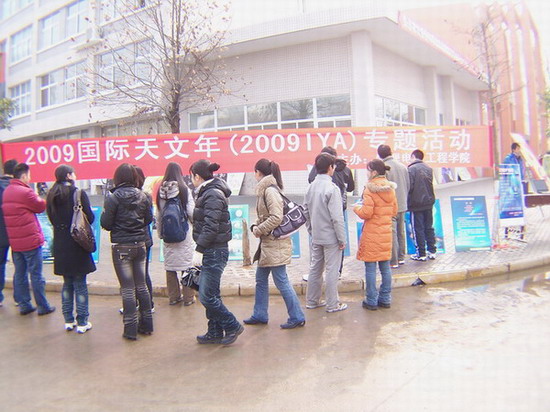 活动分为主题展板和天文主题知识讲座两个部分。主题展板系列活动包括图片展、户外视频音像展及天文知识小测试三部分,将在12月10日—11日在逸夫楼前展出。图片展分为天文望远镜发展历程展、世界著名天文台展、中外著名天文学家展三个方面。户外电脑视频对天文学的发展历程、推动天文学发展的科学家等进行了详细解说,吸引了众多员工前来观看,引起了大家对神秘太空的憧憬。最后,该院经理余本海引用温家宝总理的诗句深情地说:“我们仰望星空/她是那样寥廓而深邃/那无穷的真理让我苦苦地求索、追随……”